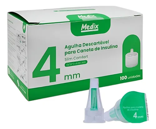 Estas agulhas para caneta de insulina são projetadas para administração subcutânea precisa e confortável. Com 4mm de comprimento e calibre 32G, são ultrafinas para minimizar o desconforto durante a aplicação. Cada agulha é fabricada em aço inoxidável de alta qualidade e vem com tampa protetora plástica estéril, garantindo a segurança e higiene necessárias. O conjunto inclui 100 unidades individualmente embaladas, com validade de 5 anos após a esterilização. São compatíveis com as principais marcas de canetas de insulina disponíveis no mercado. Cada agulha possui tampa protetora interna e externa em polietileno, além de lacre protetor em papel grau cirúrgico. O design inclui lubrificante de silicone grau médico para uma aplicação mais suave. São produtos de uso único, descartáveis, e devem ser descartados adequadamente após o uso. Esterilizadas por radiação gama, oferecem a máxima segurança para uso diário na administração de insulina.