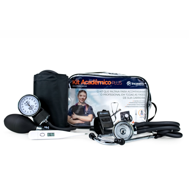 A qualidade que você já conhece em instrumentos de medição, agora acompanham os profissionais da saúde em todas as fases de sua carreira com O KIT ACADÊMICO PLUS com esfigmomanômetro, estetoscópio,  termômetro e garrote da Incoterm. Produtos INCOTERM que garantem precisão e eficiência nos cuidados da Saúde de seus Pacientes.